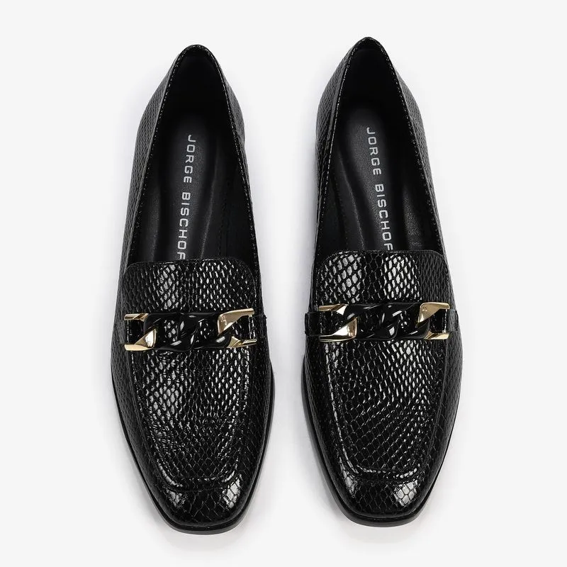 El modelo tiene tacón bajo, puntera fina y dos tiras que cruzan la parte superior del pie con hebillas, piedras y ojales en metal dorado. También tiene una tira que rodea el tobillo con una banda elástica que facilita su colocación.