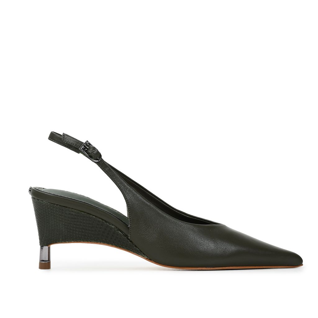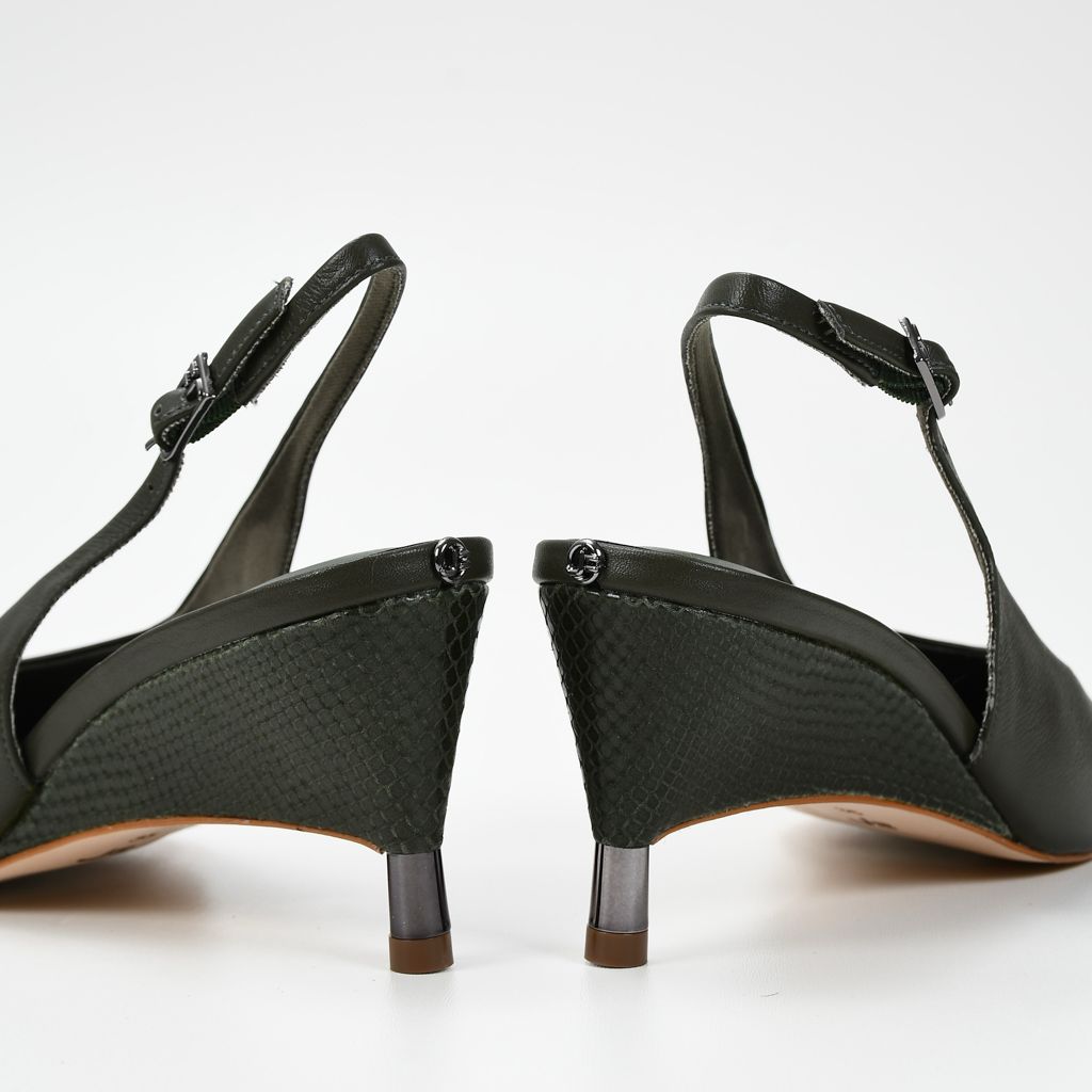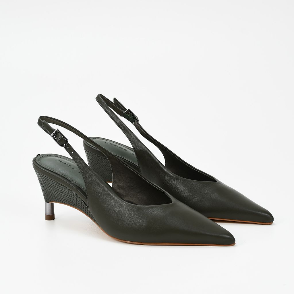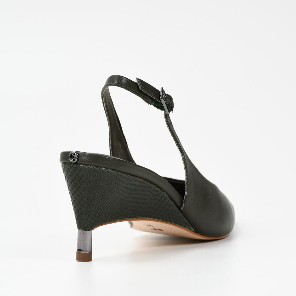 Slingback elaborado en cuero napa oliva de alta calidad, con diseño sofisticado y taco distintivo que aporta un toque moderno y diferencial.