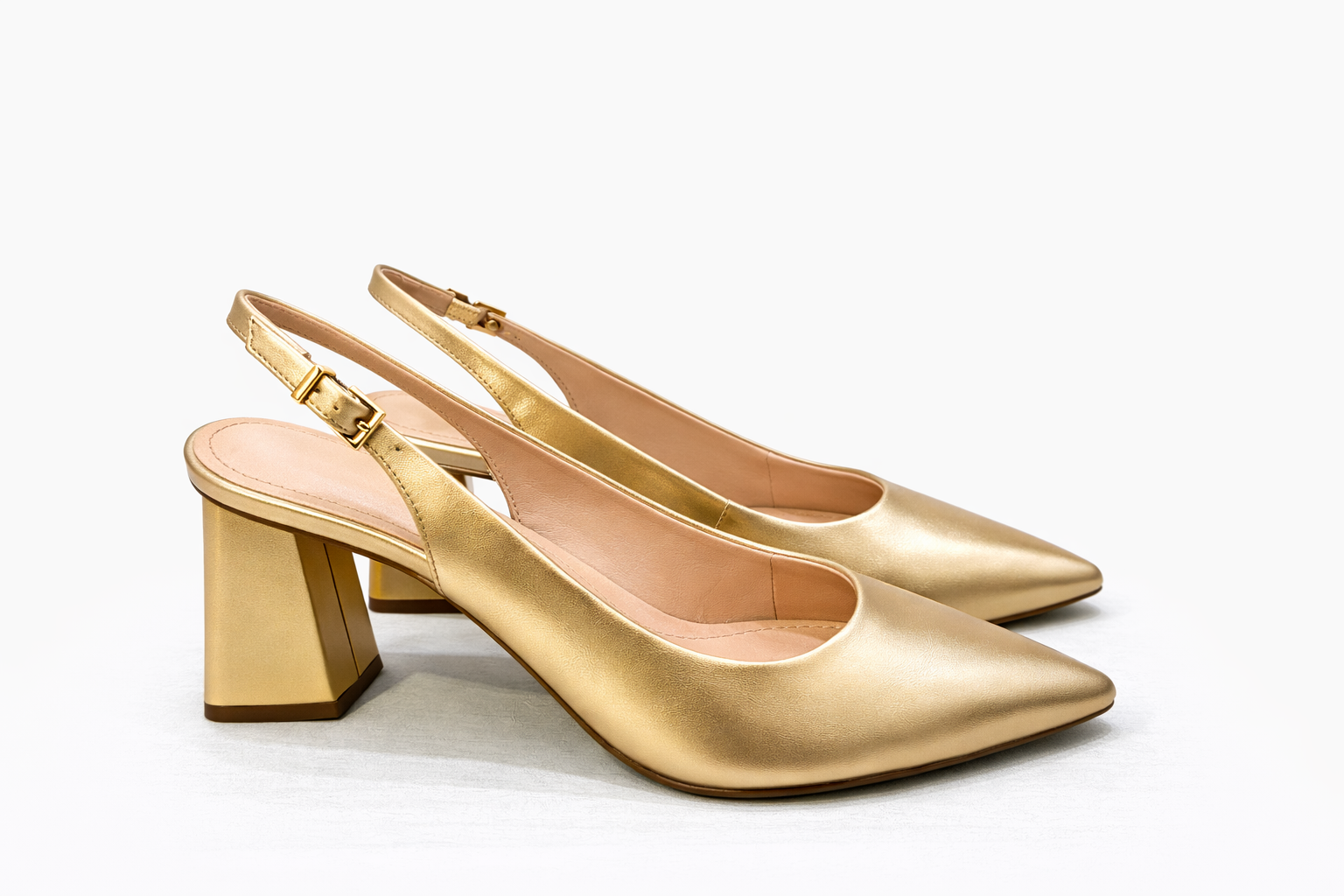Slingback elaborado en cuero oro de alta calidad, con diseño elegante y taco geométrico que aporta un toque moderno y distintivo.