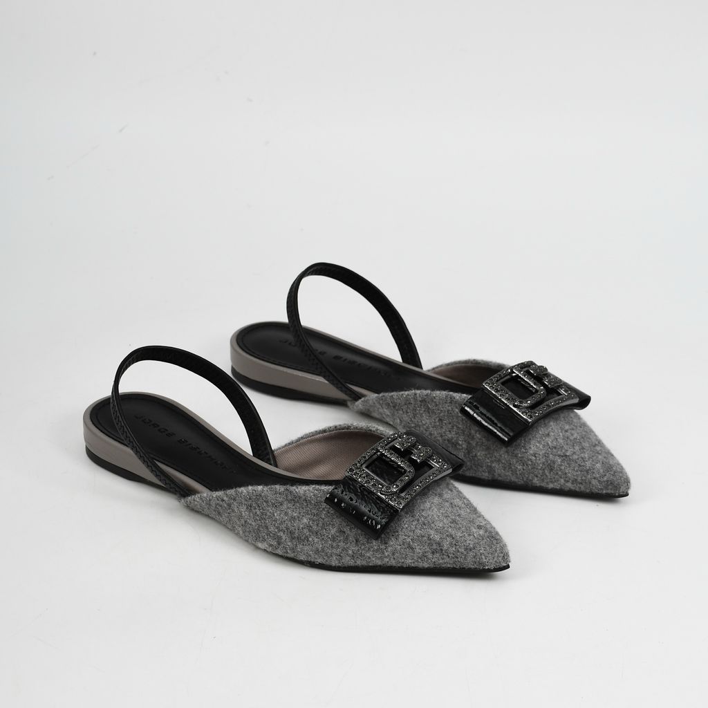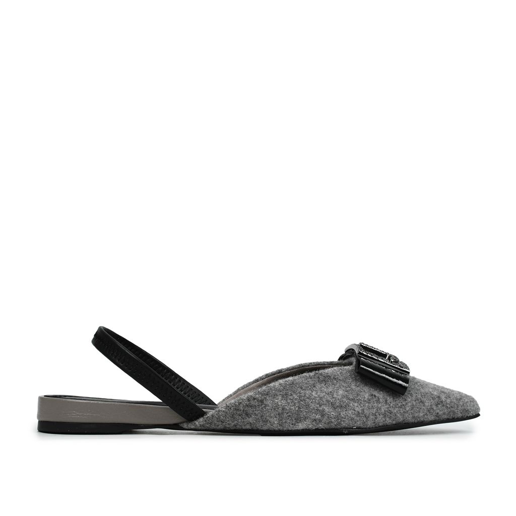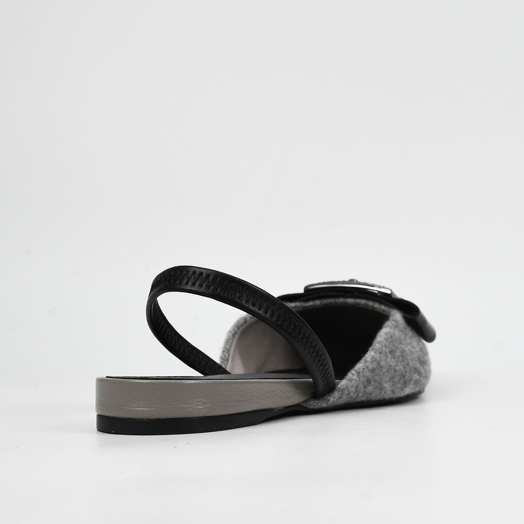Slingback estilo flats elaborado en combinación de cuero y tela en tono caliza gris, con diseño ligero que aporta elegancia y versatilidad.
